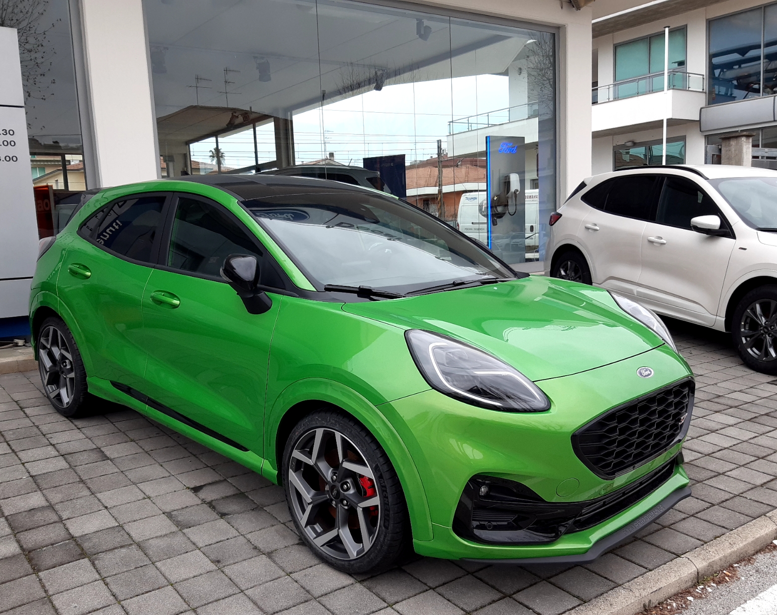 Giorni fa, ho fotografato questa presso il concessionario Ford della mia zona, colore molto bello e che le dona; il Mean Green che purtroppo è disponibile solo sulla 1.5 Ecoboost 200cv ST.