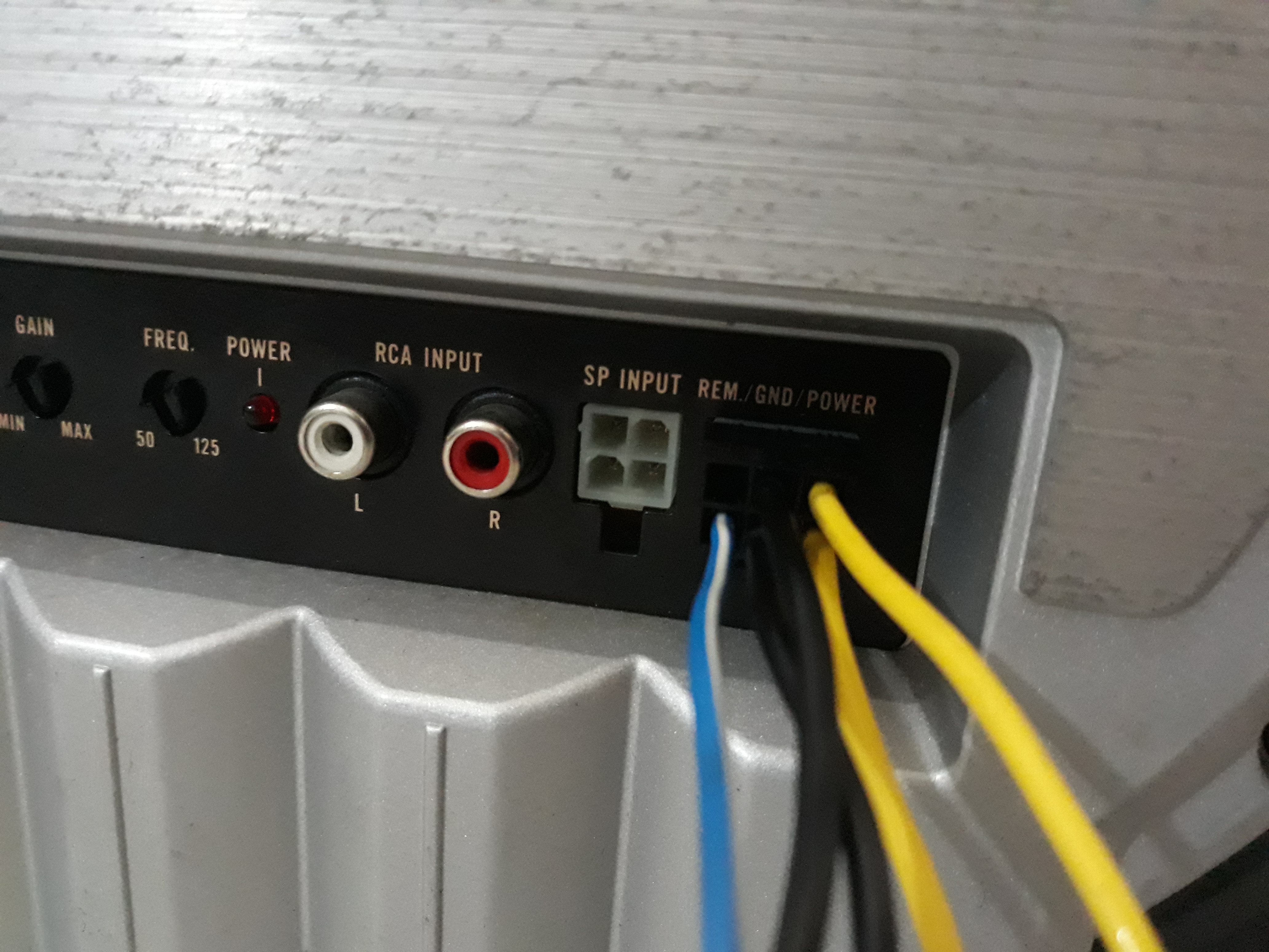 Il nero lo puoi collegare ad un bel bullone vicino a dove posizionerai il sub basta che faccia un buon contatto col telaio. Il cavo che va alla batteria (giallo) deve essere protetto con un fusibile da 15A.So che il filo Blu va all'autoradio, ovvero l'input.